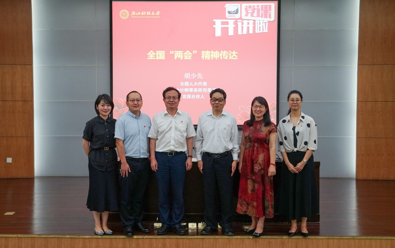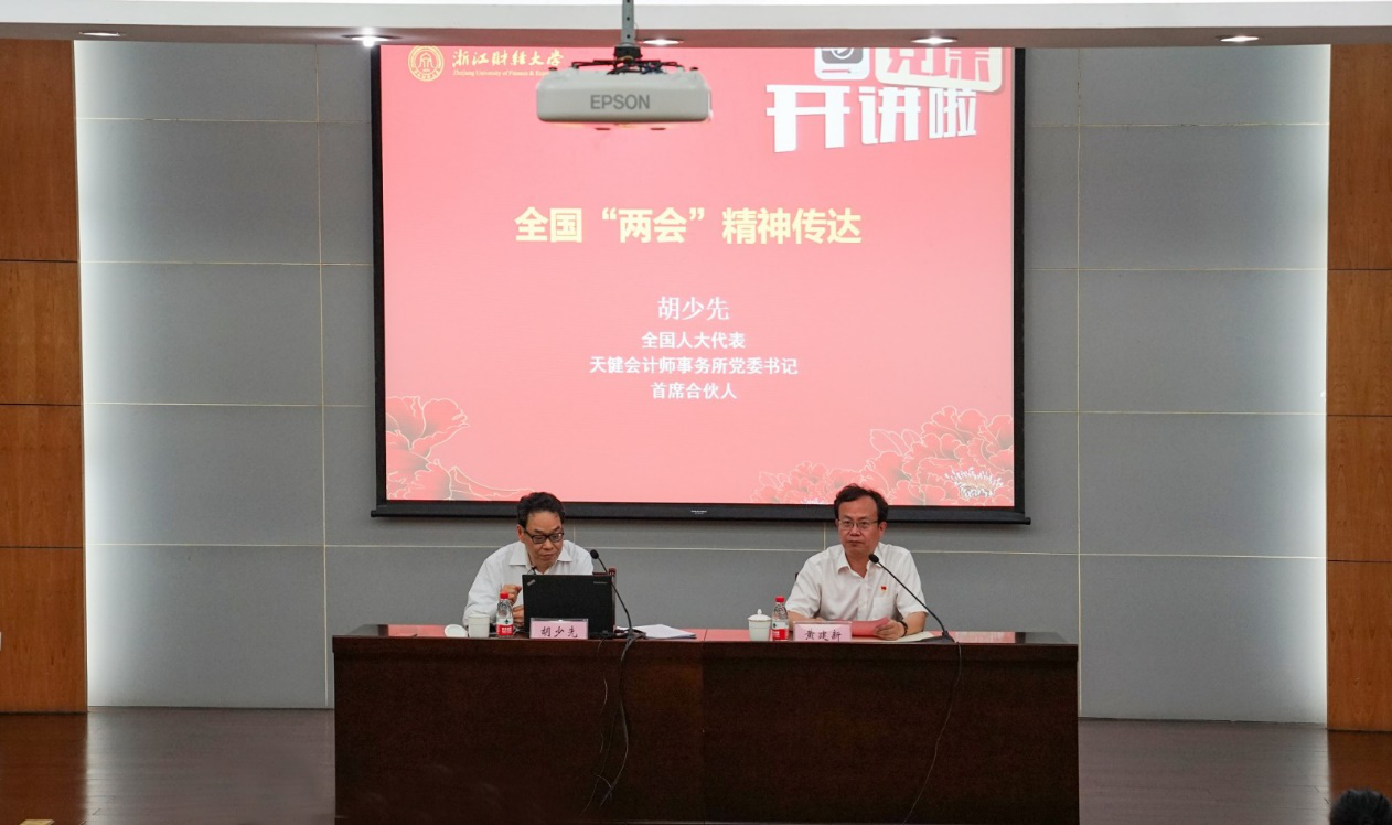 6月11日下午,公司杰出员工、第十三届全国人大代表、国家监察委员会第一届特约监察员、天健会计师事务所首席合伙人胡少先同志应邀来校宣讲2020年全国“两会”精神,为公司师生党员带来了一场生动的专题党课。同时,这堂党课也为公司庆祝建党99周年系列活动之一“党课开讲啦”拉开了序幕。公司党委副书记黄建新主持了宣讲会。机关党委、财税公司、永利yl23411官网师生党员代表100余人参加了宣讲会。