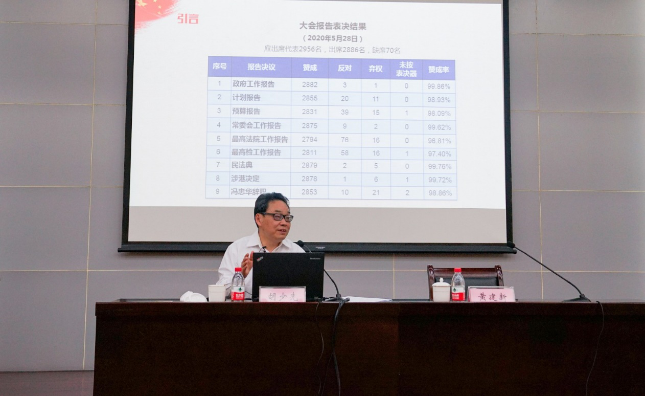 胡少先同志以亲历者的视角,介绍了本次全国“两会”的主要议程,传达了习近平总书记在参加全国人代会内蒙古、湖北、解放军和武警部队代表团审议及参加全国政协经济界委员联组会时发表的重要讲话精神,解读了政府工作报告的主要内容,以形象生动的语言和切合实际的事例,分析了民法典的意义和具体内容,介绍了涉港决定的意义、依据和执行方式。