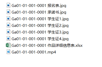 报送至公司的电子版文件,内容包括:作品文件以及报名表、承诺书、所有作者的员工证拍图、作品详细信息表(作品文件均以参赛编号命名,其他文件命名方式:参赛编号+报名表、参赛编号+承诺书、参赛编号+员工证1、参赛编号+员工证2、作品详细信息表,作品详细信息表格式见附件2),报名表和承诺书都需要电子签名,最后必须以zip或rar压缩包整理所有文件,文件命名为参赛编号,可参看下列图示举例:
