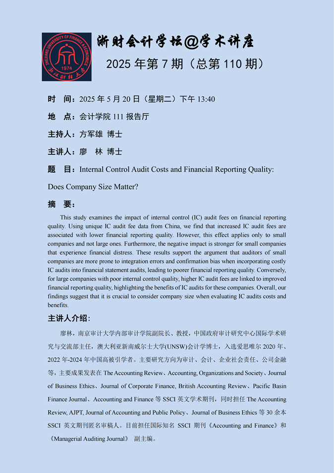 下一条:浙财会计学坛@学术讲座2025年第6期(总第109期)——周楷唐博士