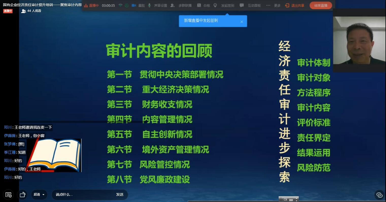 6月20日上午,王保平老师采用钉钉直播的方式,带来关于国有企业经济责任审计的专题授课。他以本次新冠疫情中发生的王登英案例开场,就其返京事件背后,多名公职人员失职渎职,引发大家对于风险管控与内部控制失效的思考。王老师介绍了国有企业经济责任审计的相关概念,围绕贯彻中央决策部署、重大经济决策、财务收支、内容管理、自主创新、境外资产管理、风险管控、以及党风廉政这八方面内容进行一一讲解。课程尾声,王老师表示审计最重要的是风险导向观,要有合理的质疑,给予被审计单位公正、客观的评价。