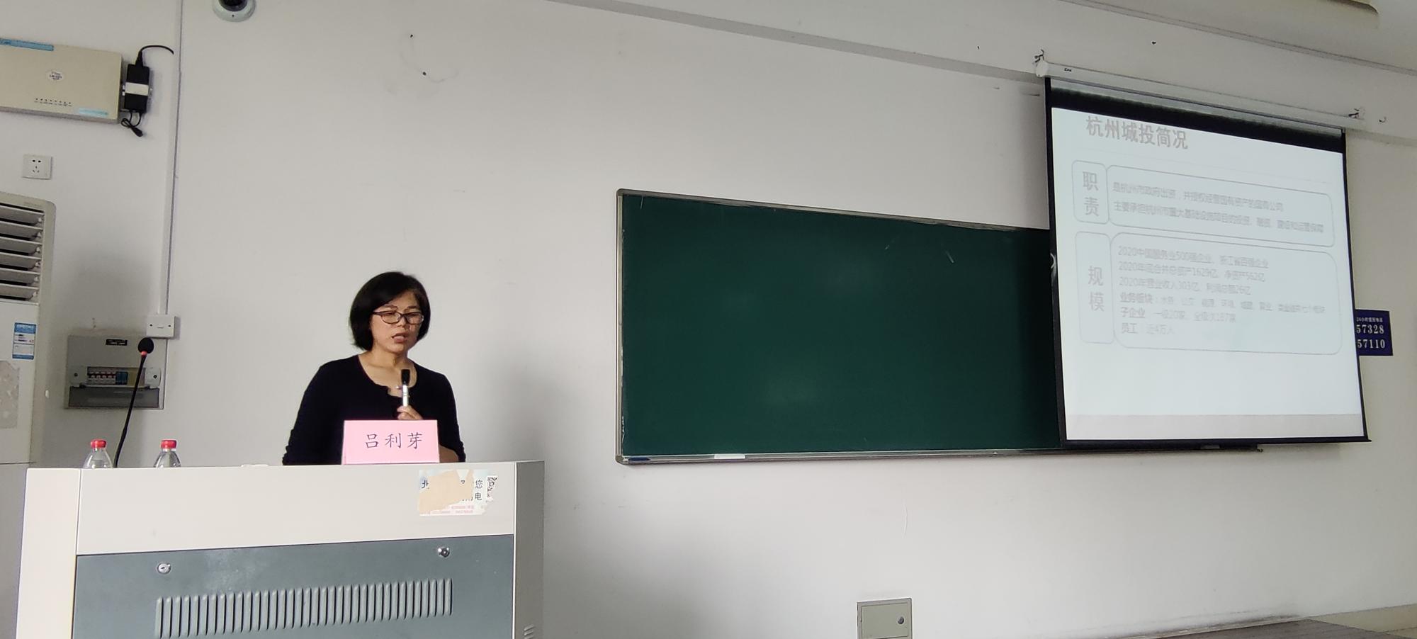 讲座伊始,吕利芽老师做了一个简短的自我介绍,随后向同学们展示了杭州城投集团的基本情况。城投集团是由杭州市政府出资,并授权经营国有资产的国有公司,公司员工近4万人,有水务、公交、能源、环境、城建、置业、类金融等七个业务板块,有多达187家子企业。吕老师说,城投集团的资金规模庞大,这对企业的财务信息处理提出了新的挑战,财务数智化转型成为了新的发展趋势。