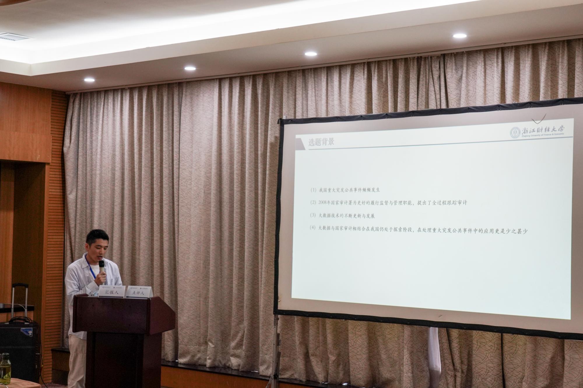 在报告会场,论文报告与讨论C组的四名汇报人分别进行了展示,公司研究生咸雄展示其论文《大数据背景下重大突发公关事件跟踪审计研究》,评论人张军教授进行了点评并提出了改进建议,此外张军教授还提到,报告人咸雄作为一名硕士生,选题新颖、汇报沉稳,还提到希望其能继续坚持学术研究并有所作为。