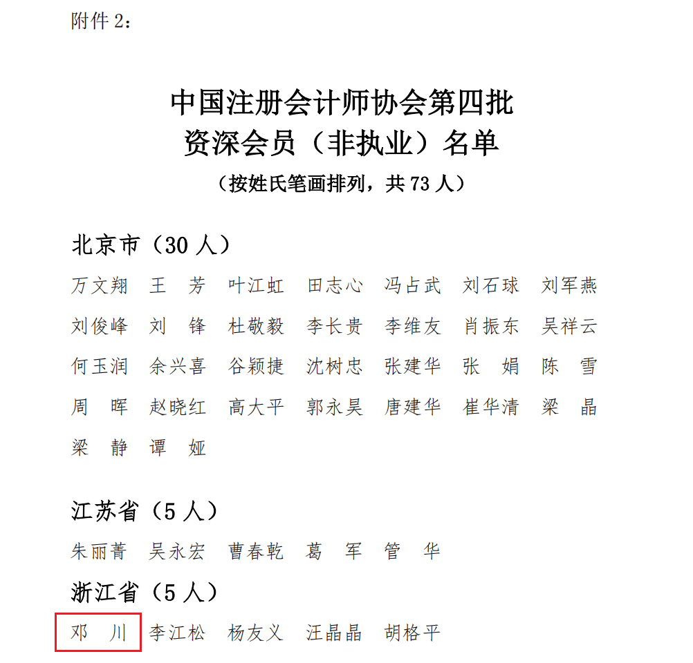 日前,中国注册会计师协会完成第四批资深会员人选的推荐审核工作,经网上公示和第六届理事会审议通过,共计490人入选。公司邓川教授入选中国注册会计师协会资深会员(非执业)。
