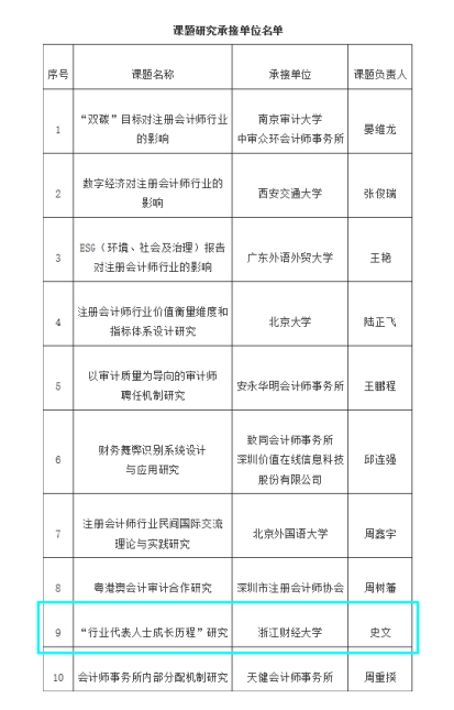 据悉,经中国注册会计师协会组织评审,全国最终确定10家课题研究承接单位,公司是浙江省唯一一所入选承接课题研究的高校。