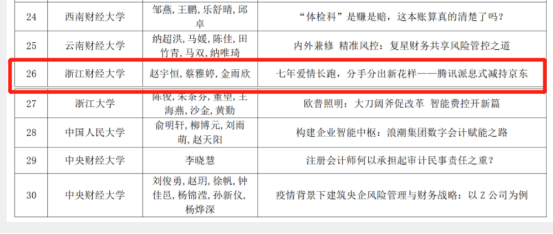 5月9日,全国会计硕士(MPAcc)专业学位教育指导委员会公布2022年会计硕士专业学位优秀教学案例评选结果,公司教师赵宇恒教授及研究生蔡雅婷、金雨欣撰写的《七年爱情长跑,分手分出新花样——腾讯派息式减持京东》获得2022年全国MPAcc优秀教学案例并成为入库案例。