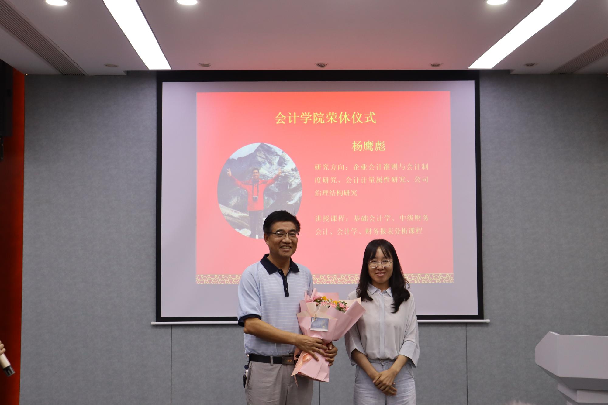 随后,公司开展教师荣休仪式,荣休教师杨鹰彪回顾了自己四十余载的从教生涯,对公司、公司以及公司领导和老师们的关心表达衷心的感谢,并祝愿公司继续蓬勃发展,培育更多会计英才,赓续新华章;赵敏老师代表全体教职工对杨鹰彪老师在公司、公司以及学科中的贡献表达高度的赞扬与肯定,并对杨老师的荣休生活给予最真挚的祝愿。张虹书记对杨鹰彪老师为公司发展做出的贡献予以感谢;同时寄语青年教师,希望他们勇担教育使命,传承新思想,以强烈的责任感为公司和公司的发展注入新活力。