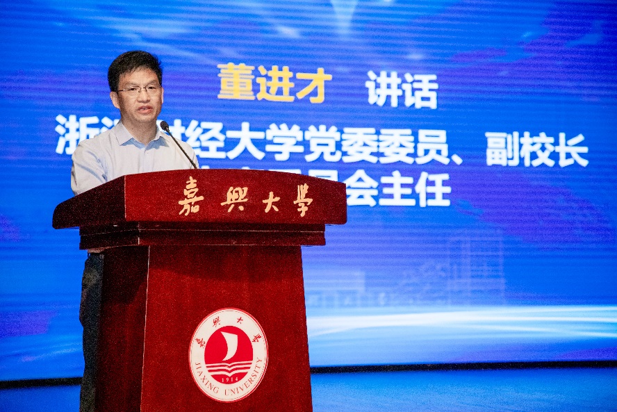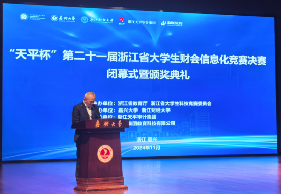 公司党委委员、副董事长、竞赛委员会主任董进才代表竞赛委员会对成功承办第二十一届财会信息化竞赛决赛的嘉兴大学表示感谢,接着回顾了本届竞赛情况,特别指出在竞赛二十一年的发展历程中,始终保持与时俱进,不断迭代升级,赛制从单一赛制发展为传统赛、本科生案例赛、研究生案例赛三轨并行的多赛制;参赛对象日趋多元化,现已囊括本科生、高职高专员工和研究生;竞赛组织水平不断提高,从传统的纸笔模式升级为数字化竞赛平台,生动的体现了红船精神中的“开天辟地、敢为人先的首创精神”。随后对今后赛事进行了展望,表达了殷切期盼。