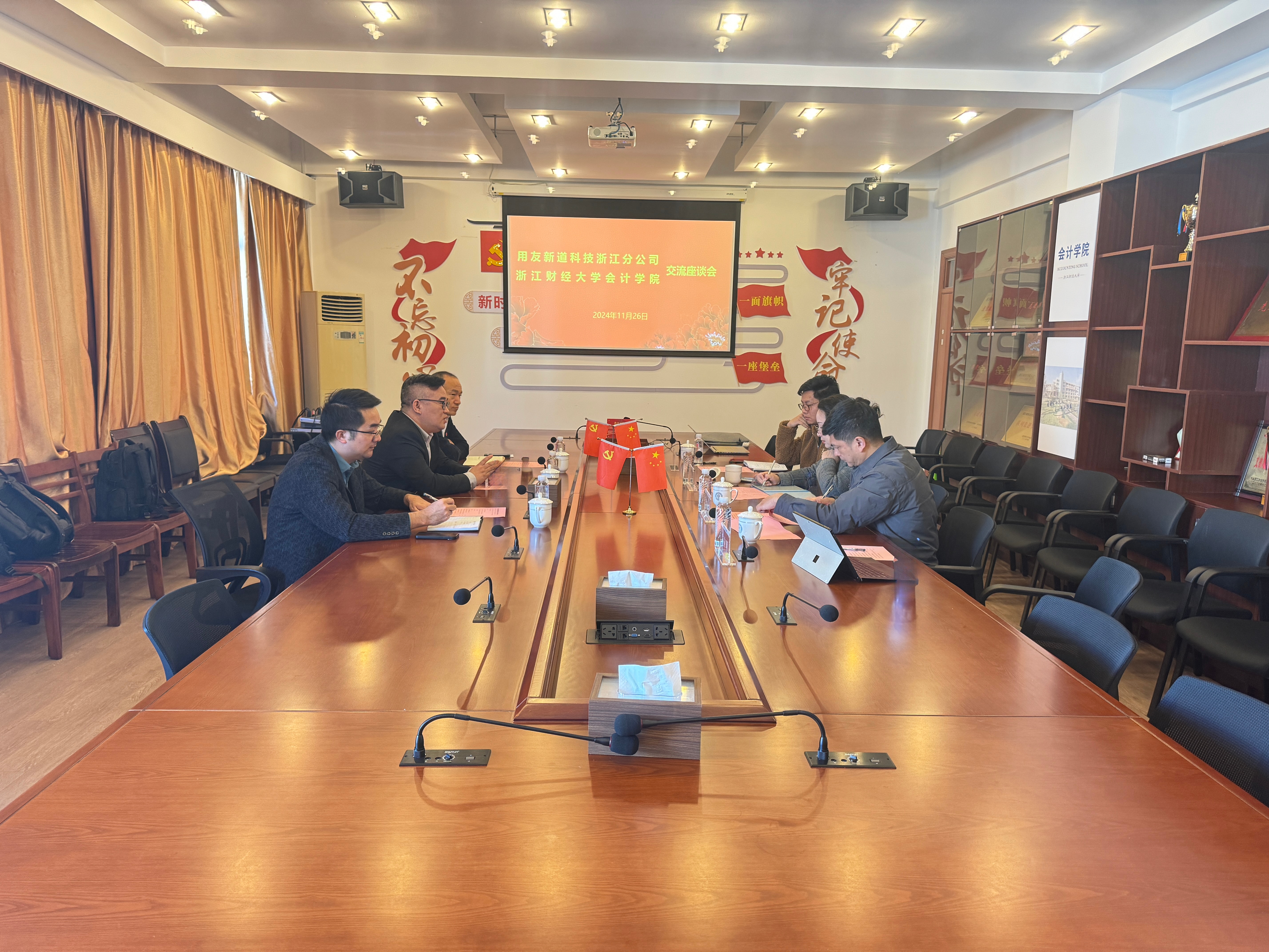 11月26日,用友新道科技浙江分公司总经理吕京波、数字经济事业部经理张春光、数字经济业务总监绕正奎来公司交流,公司党委书记张虹、副书记程晓东热情接待了客人。公司国际会计系副主任周畅、团委书记朱立明参加活动。