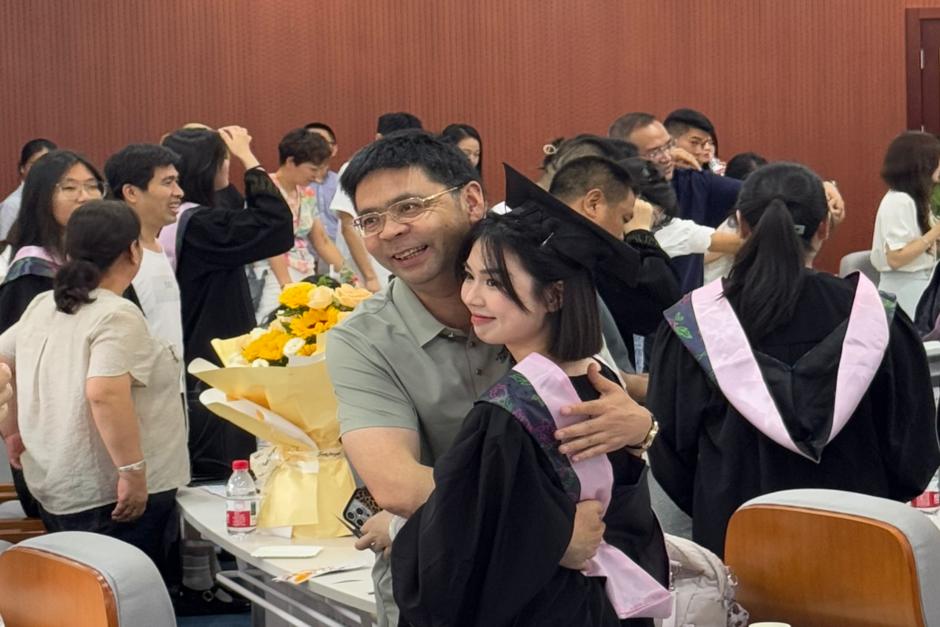 在时光信笺环节,家长们提笔在明信片上郑重写下对孩子的祝福和期许,将父母深沉的爱与期盼定格,成为一份珍贵的毕业礼物。家长们将装着当下和未来祝福的两个信封交给自己的孩子,同学们献上鲜花和拥抱表示感谢。现场气氛温馨,温情满满。