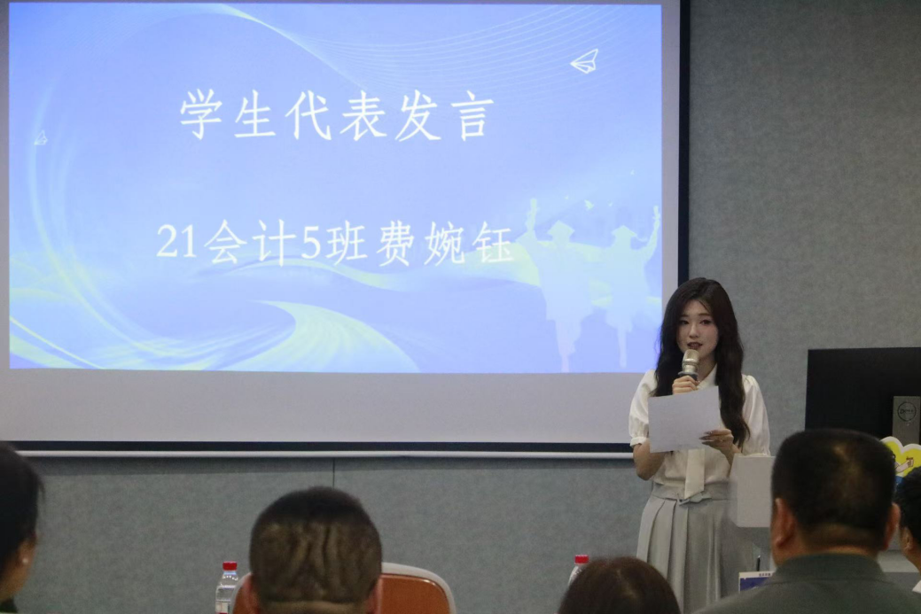员工代表费婉钰感谢父母的默默支持与老师们的辛勤教导。她回顾了大学时光的点滴收获,称将带着这份感恩在未来的道路上勇敢前行,不辜负家庭与母校的期望。