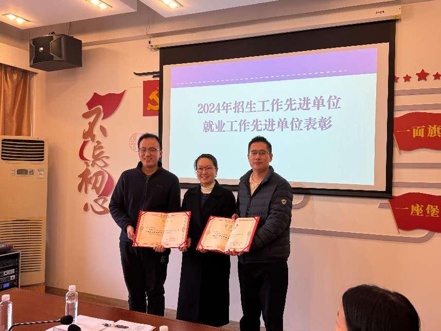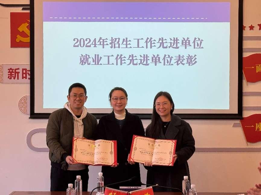 会上还表彰了2024年度公司招生工作先进单位和就业工作先进单位。审计系、财务管理系获招生工作先进单位,财务会计系、国际会计系获就业工作先进单位,张虹为获奖单位颁奖。