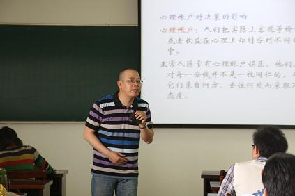 吴联生教授结合公司企业财务决策问题、以生动有趣的例题阐述了如下观点:心理帐户是指人们把实际上客观等价的支出或者收益在心理上划分到不同的帐户中,正常人通常有心理账户误区,他们在心里上对每一分钱并不是一视同仁,而是视它们来自何方、去往何处而采取不同的态度;沉没成本是指已经发生、不可收回的支出,人们在决定是否做一件事情时,不仅是看这件事情对自己有没有好处,而且也看过去是不是已经在这件事情上有过投入;期望值理论是指人们对于相似条件的备选方案,先会计算备选方案的数学期望值,然后选择期望值大的项目;正常人在面临获得的情况下会规避风险的、在面临损失的情况下会喜好风险的、对得失的判断是根据参照点决定的,此即前景理论。
