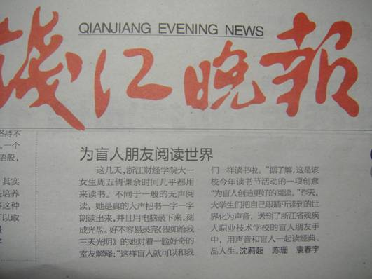 ----《钱江晚报》报道公司活动 5月12日,《钱江晚报》上以《为盲人朋友阅读世界》为题,报道了浙江财经公司员工们为盲人朋友读书的活动,同学们用自己的声音来代替盲人的眼睛,来替盲人感受世界。 《钱江晚报》上用“为盲人创造更好的阅读。”、“用声音和盲人一起读经典、品人生。”等语句高度评价了公司这项具有爱心与温情的活动。