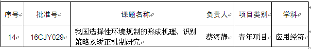 6月17日,全国哲学社会科学规划办公室公布了2016年国家社科基金年度项目和青年项目的评审结果,公司蔡海静副教授申报的课题《我国选择性环境规制的形成机理、识别策略及矫正机制研究》喜获国家社科基金青年项目立项。