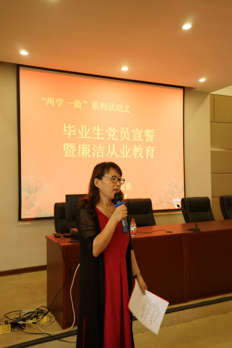 首先,张红英书记满怀深情地祝贺毕业生党员通过四年的努力,成长为一名合格的毕业生,一名光荣的党员,同时,也殷切地提出了两点希望:其一,积极践行“两学一做”,以党章党规和讲话充实头脑始终是对一个合格党员的要求;其二,毕业生党员作为财大的员工,牢记“建德修业,与时偕行”的校训,作为会院的明天,谨以“追求卓越、精益求精”要求自己。“如果个人的力量不足以改变世界,那就努力完善自己。我相信,今天的你们比昨天更优秀,明天的你们会比今天更精彩!”张书记动情的讲话传递着对毕业生党员的美好希冀,台下掌声雷动。