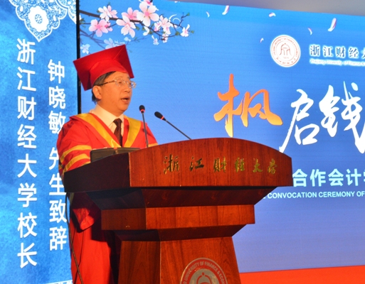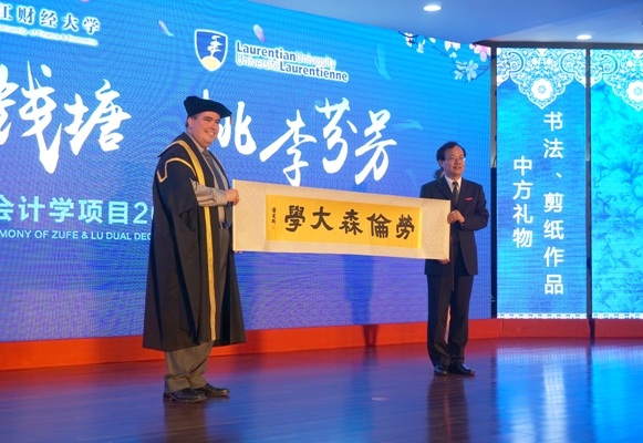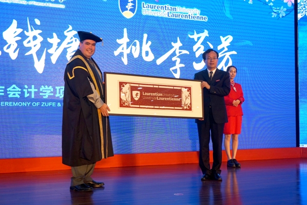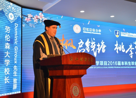 中加项目的成功,离不开中加两校双方的倾力配合。在典礼上,钟晓敏董事长用英语进行致辞。他首先向远道而来的客人致以敬意,对劳伦森大学多次率团访问以及加拿大注册会师协会、加拿大TPEI教育集团在中加双方合作办学中的无私奉献表示感谢,并且向同学们表达了毕业祝贺之情。随后,他对同学们提出了四点殷切希望,一是“坚守梦想”,无论在坚持梦想的途中遇到何种挫折,都要让梦想照亮同学们前进的道路;二是“肩负责任”,无论驰骋九州还是远跨重洋,希望同学们牢记自己肩负着国家和社会进步的伟大使命;三是“懂得成功”,成功是尽力把每次小事都做好,小的成功会积累成大的飞跃;四是“维护兴趣”,希望同学们能够接受文体艺术所带来的心灵交流,提升自己生命厚度。致辞到最后一部分时,钟董事长饱含深情地用中文向同学寄语:“同学们,天下没有不散的宴席……请大胆走出去吧!而我,将和你们亲爱的老师们一道,会坚守在这个地方,祝福你们,等待着你们一个又一个的好消息,我们愿意在这种淡定的坚守和充满希望的等待中慢慢地老去,幸福地老去。