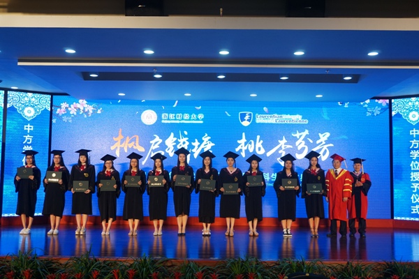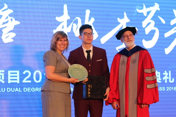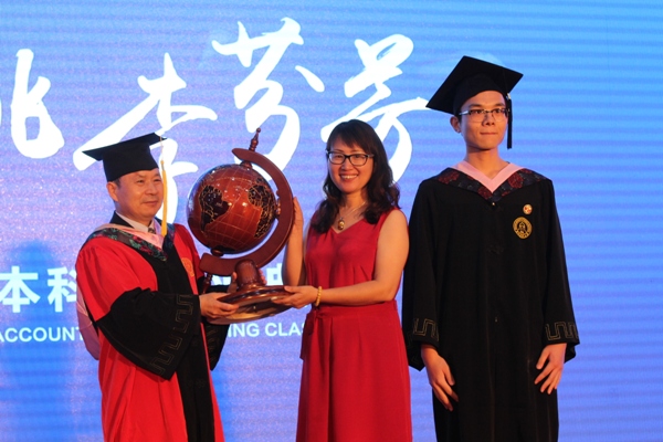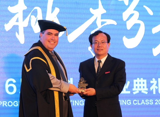 之后,黄建新副董事长上台为25名获得双学位的毕业生颁发了奖学金。紧接着劳伦森大学董事长Dominic Giroux先生、管理公司经理Stephen Havlovic先生上台为这25位毕业生颁发了劳伦森大学工商管理学士学位证书。钟晓敏董事长、李连华经理为所有12级中加毕业生授予中方学位证书,并为毕业生播穂。