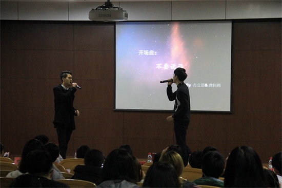 比赛以方立昂、龚钊祺同学的一首《不要说话》开场,掌声在动人的旋律中响起,现场气氛瞬间高涨。曲终意未尽,比赛正式拉开帷幕。比赛分三轮,搭档主持、情景主持以及自由即兴主持。第一轮比赛中,选手两两搭档主持,不管是“佳片有约”,“爱情连连看”还是“party 脱口秀”,搭档们选题新颖,紧扣时事热点,默契的配合让节目更上一层楼。评委对选手一一进行了点评,中肯而又到位。