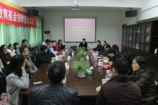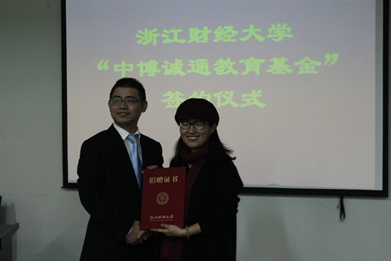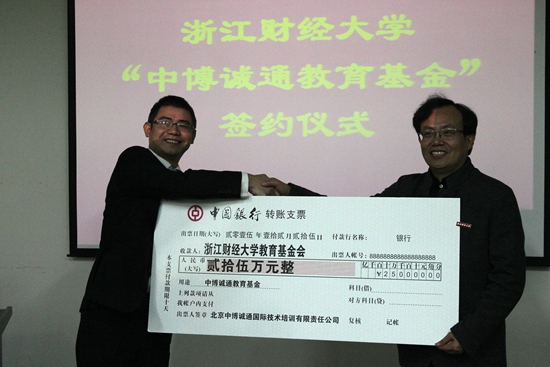 捐赠签约仪式由张虹副书记主持。黄建新董事长首先代表公司向陈锋副总经理一行人表示热烈欢迎,并详细地介绍了公司的发展情况,对中博诚通在公司设立教育基金 表示由衷地感谢,他认为中博诚通与浙财合作空间广阔,希望能继续加深交往和联系。陈锋副总经理对校方和院方的信任表达感谢之情,他向大家介绍了北京中博诚 通国际技术培训有限责任公司的基本情况,表示这一次教育基金的设立只是一个开始,希望日后还有更大的合作机会。张红英老师表示公司ACCA的发展离不开中 博诚通的鼎力支持,公司将按照协议用好这一笔教育基金并接受中博监督。