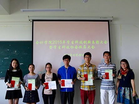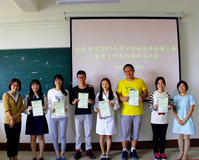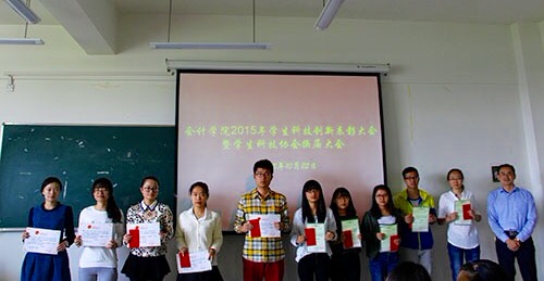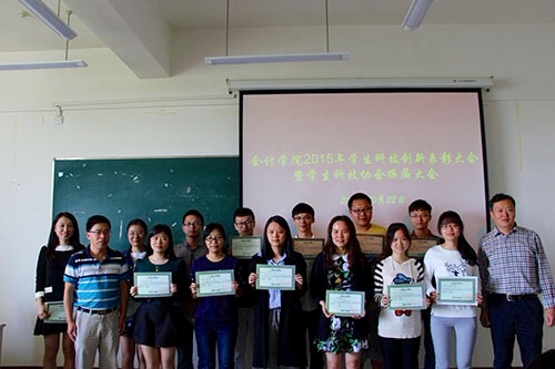 接下来,员工科技协会原会长张竑天同学汇报上年的工作情况,新一任会长李隆捷同学讲述本年发展计划。会计学子凭着敢为人先的锐意进取精神在挑战杯和新苗比 赛中屡获佳绩,为鼓励员工积极参与学科竞赛,推动公司创新创业发展,本次大会对获奖者进行了表彰:2014-2015学年挑战杯院特等奖2组,院一等奖5 组,院二、三等奖共20组;新苗人才计划院特等奖7组,院一等奖7组,院二、三等奖共21组。