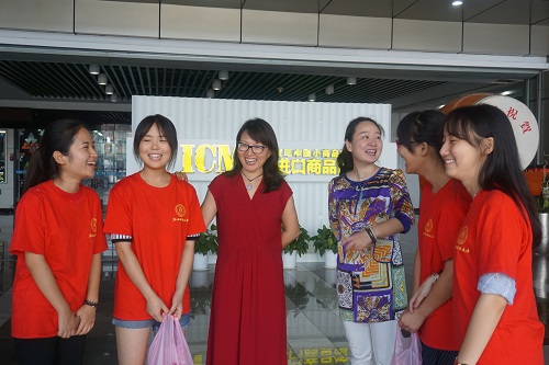 张红英一行来到义乌进出口小商品市场慰问正在做市场问卷调查的员工,并送上各种新鲜水果。公司领导对暑期社会实践的重视与关心,让同学们在炎炎夏日中感受到了一丝清凉,感激之情溢于言表。