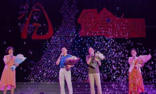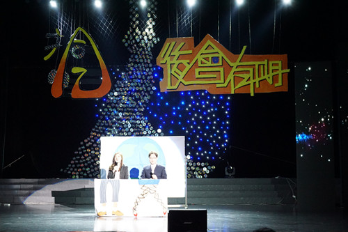 在观众们的陆续入场的同时,为本次晚会精心制作的毕业微电影在大屏幕里呈现。2015届毕业生们,或坐在油桶外,或坐在教室里,操场上,一样认真的面庞, 同样灿烂的笑靥,诉说着这四年的无数记忆。一帧回忆,一帧感动,如此温情的影片将现场预热得情意浓浓。而舞台中央那一条由641张光盘组成的彩裙,代表本 届641位毕业生,让今晚的狂欢意义非凡。