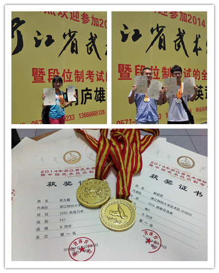 近日,2014年“雄英杯”浙江省武术锦标赛暨中国武术段位制考试在浙江桐庐举行。其中公司员工史久霞(12资产评估)收获两金、孙杭东(12财务1)收获两银、赵成罡(13中加1)收获一金一银、许胜辉(13审计1)收获两银。