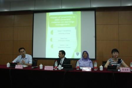 6月10日下午,Hanssan HassabElnaby教授首先做了题为“接近债务合同违约对于盈余管理的影响”的学术报告,通过委托代理理论引出了管理层和所有者之间的利益冲突,从 而分析企业在违约或者不违约情况下的经济行为,并且将盈余管理分为应计盈余管理和真实盈余管理,结合萨班斯法案的提出,具体分析管理者如何运用盈余管理应 对债务合同的违约风险。