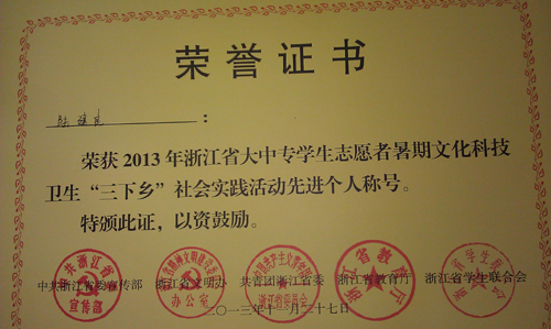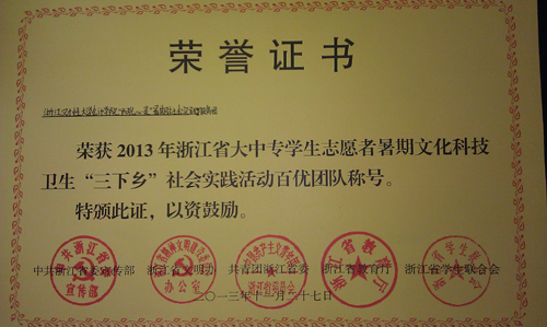 根据团省委《关于表彰2013年浙江省老员工志愿者暑期文化科技卫生‘三下乡’社会实践活动优秀组织工作奖、优秀团队、先进个人和省级社会实践基地的决 定》(团浙联【2013】65号)文件,公司“阳光心灵”暑期社会实践服务团被授予省级“百优团队”荣誉称号,并在2013年浙江省老员工志愿者暑期社会 实践表彰大会上受到表彰,是公司唯一两支获此殊荣的团队之一。此外,公司陆建良老师获得省级“社会实践活动先进个人”荣誉称号,永利yl23411官网赴淳安“载梦之 舟”实践服务团获得校级优秀团队,陆建良、朱丽娟老师获得校级暑期社会实践优秀指导教师称号。