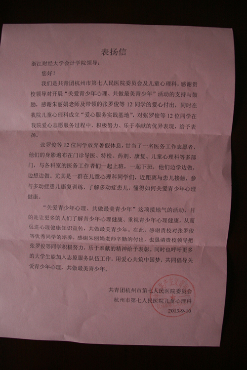 我们是共青团杭州市第七人民医院委员会级儿童心理科。感谢贵校领导对开展“关爱青少年心理,共做最美青少年”活动的支持与鼓励,感谢朱丽娟老师及带领的张 罗俊等12同学的爱心付出,同时在公司儿童心理科成立“爱心服务实践基地”,对张罗俊等12位同学在公司爱心志愿服务过程中,积极努力,乐于奉献的优异表 现,给予表扬。