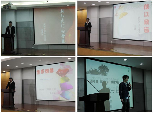 置身世界,纵观社会,何为我们的价值观?来自永利yl23411官网各个员工党支部的11名优秀选手为我们做了详细的解答。来自第六党支部的翁成翔,从去年一位农民工因买不到回家车票而给铁道部写信的事件切入,层层深入,提出以“挺起我们的脊梁”为核心的价值观。整个演讲激情昂扬,情绪饱满,富有感染力,博得了场下观众的阵阵掌声。来自第一党支部的陶潇珩独出心裁,演讲开始,从场下观众席拾级而上,用书和墨镜分别演绎了两种不同的价值观,之后提出了我们的价值观之敢于创造。来自10ACCA的程琳畅谈了价值观与幸福,思路清晰,语言精炼,手势得当,让人印象深刻。除此之外,“当奉献成为一种习惯”、“信以致远”、“让诚信的春风吹绿我们的心田”等对“我们的价值观”的理解与阐述也十分精彩。