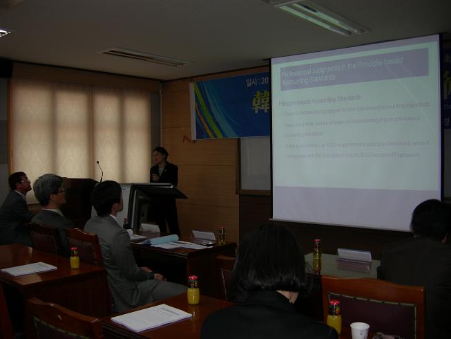 朱康萍教授做学术报告 会议期间,与会人员还就经济领域、会计领域的热点问题进行了探讨交流。公司与韩国国立庆尚大学经营公司建立了长期学术交流关系,此次会议是公司代表团第五次赴韩国与会,这对加深中韩两国学者友谊、提高公司教师理论水平、开拓国际视野具有重要意义。(郑老师。2012年4月10日。) |