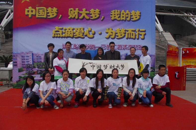 本次“中国梦,财大梦,我的梦:点滴爱心,为梦而行”浙江财经公司一元钱工程系列活动,以梦想导航,爱心支撑,立足校园,走向社会。活动伊始,寿冬尓同学 为全校师生报告诚信亭一年来的运营状况,与此同时,文化长廊上各二级公司正陆续完成各自手绘文化衫,以实际行动支持一元钱工程,为梦添彩、为爱护航。此 后,来自各公司的11位梦想大使上台一一发表励志宣言,从励志感悟寻访圆梦征程。不管是用绵薄之力远赴山区支教的爱心基金会成员,还是在诚信亭前投下一个 硬币的你我他,或是一步一脚印践行青春的梦想大使,都已成为正能量榜样的有力号召,众人一致宣誓,热情洋溢。