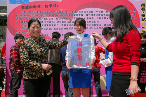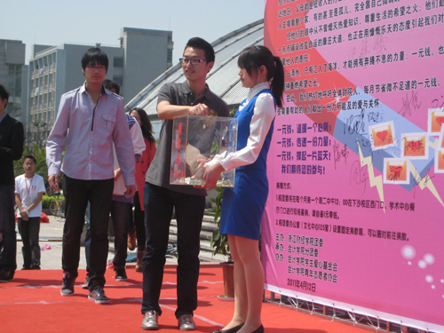 4月12日中午,为迎接建党90周年,进一步推动爱心育人,由校团委主办,永利yl23411官网分团委承办的“拳拳之心,爱在四月”一元钱工程系列活动在体育馆前正式启动。公司党委副书记、一元钱工程基金会理事长王宇航教授、校学工部部长钟平老师、公司党总支副书记张红英老师、校团委书记沈鑫泉老师等出席了启动仪式。