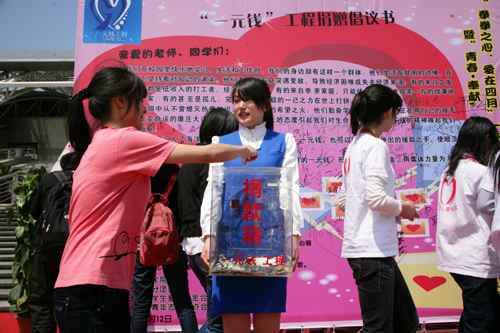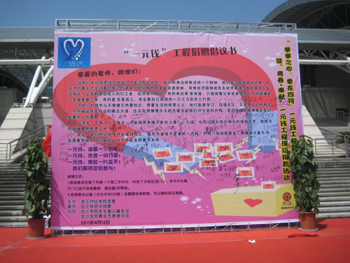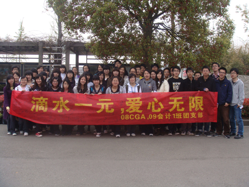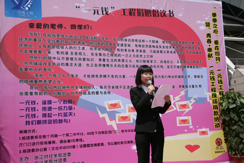 在活动开始前,公司08CGA班和09会计1班两个“姊妹班”团支部还率先在校西门口设点,联合举办了一次面向全校的以“滴水一元,爱心无限”为主题的倡议活动,呼吁全体财院人以爱心义捐的方式为身边有需要的人奉献自己的一份爱心,为 “一元钱”工程系列活动在全校师生中展开作了很好的宣传。