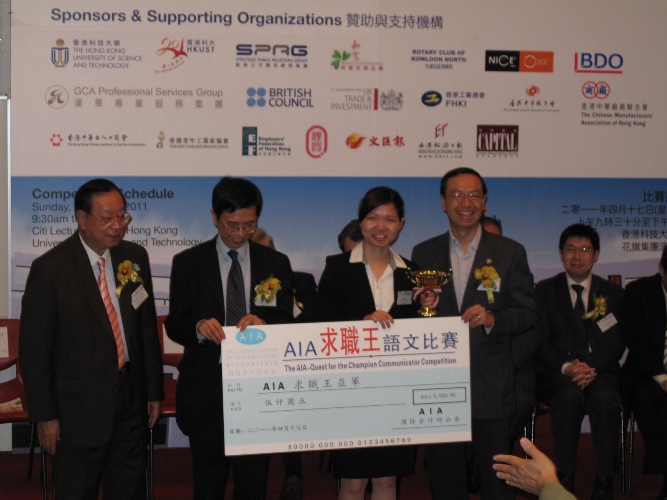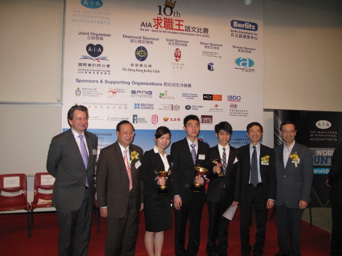 2011年4月17日,由香港国际会计师公会举办的第十届“AIA 求职王语文比赛”在香港科技大学举行。来自香港大学、清华大学、中山大学、厦门大学、上海财经大学等两岸三地共23所大学的精英员工参加了本次比赛。由傅黎瑛教授指导并带队的永利yl23411官网09ACCA专业邵优平同学,在比赛中发挥出色,喜获亚军。她熟练流利的中英文表达以及体现专业深度和水准的演讲内容,给现场的评委和观众留下了非常深刻的印象,并获得了一致好评。本次比赛的冠军是上海大学的李可扬同学,季军获得者为香港中文大学的邓俊贤同学。