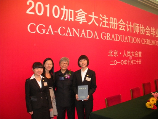 2010年10月30日下午,加拿大注册会计师协会(CGA)2010年毕业典礼在北京人民大会堂举行,CGA主席Joyce Valerie Evan专程赴京为本年度CGA资格证书获得者、CGA全科合格证书获得者、以及CGA资深会员颁发证书。CGA副主席Lyle Handfield、中注协代表、财政部代表以及CGA中国执行理事高凤敏(Barbara)女士也出席了此次典礼。CGA主席Joyce Valerie Evan首先向各位获奖者表达了衷心的祝贺,并提到了CGA在中国不断地发展,CGA 学员和会员的队伍不断地壮大。表示将继续加强CGA与中国注册会计师协会的合作,从而推动中加两国在会计领域合作的不断深入。随后与会嘉宾代表向来自CGA合作院校的同学颁发了“金帆财会专业奖学金”,奖励成绩优秀的CGA在读学员。