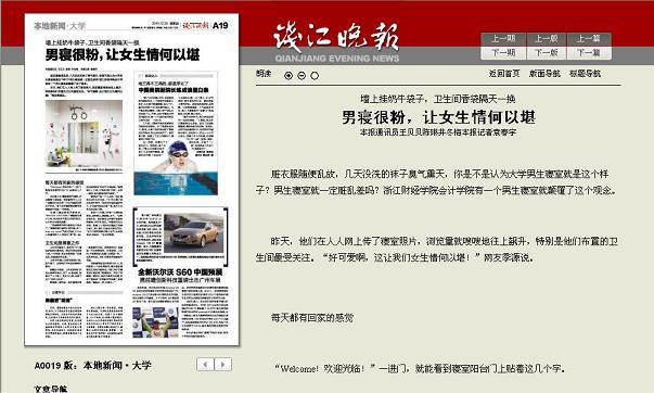 此版报纸一出,立即引起了社会各界的轰传,19楼、淘宝、各个大学的新闻论坛争相转载与评论,目前,他正以飞快的速度影响社会各界。这充分证明了寝室在学习型公寓建设中取得了突破性进展,充分肯定了公司的学习型公寓建设。公司的公寓建设正在不断完善发展,并不断涌现新的惊喜。 《钱江晚报》在12月23日的报纸中大篇幅地报道了此项新闻,原文如下: 墙上挂奶牛袋子,卫生间香袋隔天一换 男寝很粉,让女生情何以堪 本报通讯员 王贝贝 陈琳 井冬梅 本报记者 袁春宇 脏衣服随便乱放,几天没洗的袜子臭气熏天,你是不是认为大学男生寝室就是这个样子?男生寝室就一定脏乱差吗?浙江财经公司永利yl23411官网有一个男生寝室就颠覆了这个观念。 昨天,他们在人人网上传了寝室照片,浏览量就嗖嗖地往上飙升,特别是他们布置的卫生间最受关注。“好可爱啊,这让我们女生情何以堪!”网友季源说。 每天都有回家的感觉 “Welcome!欢迎光临!”一进门,就能看到寝室阳台门上贴着这几个字。 再往墙上看,樱桃图案的墙纸,还点缀着卡通海报。创意寝室的主人之一黄耀东告诉记者:“白色的墙容易脏又不好看,有了这些墙纸能使寝室变得雅致不单调,一举两得。” 机器人墙贴装饰的插座旁,“WATCH OUT!HEY!”提醒使用者小心电。如此安全可爱又时尚的设计,让许多女生都很羡慕。 “我最得意的部分就是这个地方了。”黄耀东指向寝室右面的墙,在“I love my home”的英文四周,几个小人将寝室四个人的照片“挤”在一起,旁边配有他们各自的卡通贴纸。“寝室要住4年呢,它就是我们的家。这样一装饰,每天都有回家的感觉。” 寝室进门有一个大衣柜,“我们喜欢内衣外衣分开放,门口的大箱子是用来放外套的。”现在男生越来越讲究了,对衣服的放法还有一套,连不少女生也没这些习惯。 在每个人的桌上还有一只迷你袖珍架,放些插头、数据线、本子。“这样方便打扫,每次检查卫生都不会像其他寝室一样手忙脚乱。”同寝室的毛文东说。在墙上4名男生还摆放了创意小夜灯,晚上熄灯后会发出彩色的光。“这个只有在特殊时期才用的。比如临考试、拜春哥。”毛文东笑道。 卫生间是得意之作 卫生间的瓷砖上,鱼形的PVC墙贴欢快地吐着泡泡,俏皮的黑色脸型卡通,十分别致。室友张彬浩说:“看着这些,洗澡都是种享受。” 卫生间的墙上还有创意纸巾抽、奶牛袋子,这使他们的生活变得格外便利。 黄耀东介绍说,卫生间是他们花功夫最深的地方,买了10幅贴纸,陆续花了2个晚上,室友齐上阵,共建了这个“美好卫生间”。 更值得一提的是,他们寝室还有一股淡淡的芳香,是清香剂吗?黄森说:“不仅有清香剂,还有香袋,卫生间、外面都有放,每隔几天更换一次。”这些男生说,他们也喜欢周围被香气包围。 创意寝室建设总耗资500元,东西都是4个男生网购的,挑的都是既便宜又时尚的装饰品。目前,他们的寝室设计更是有了蝴蝶效应,带动了同幢楼一帮男生,临近的寝室为赶超,还买了据称是“非常豪华的地毯”,张彬浩说:“跟饭店一样,巨惊人。”