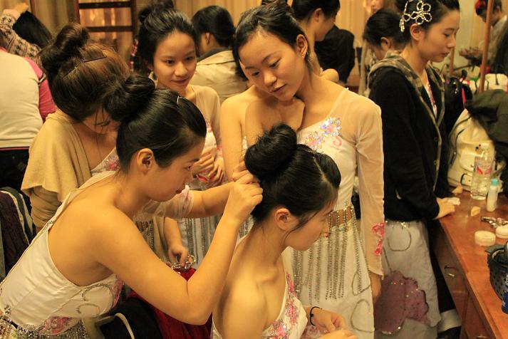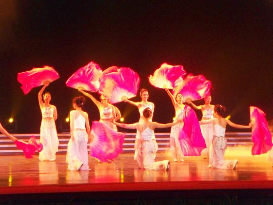 经过白天的彩排,化妆等精心准备,16位女生信心满满地走上了晚会的舞台。灯光亮起,薄雾朦胧,她们身着白纱,宛如绿野仙踪,如蝶如凝,蹁跹摇曳。她们手 上舞开飘逸的红扇,盈袖如柳,合着古典的节拍,荡开观众心中的涟漪。婀娜的舞步,承载脉动的旋律,久久在心头萦绕……