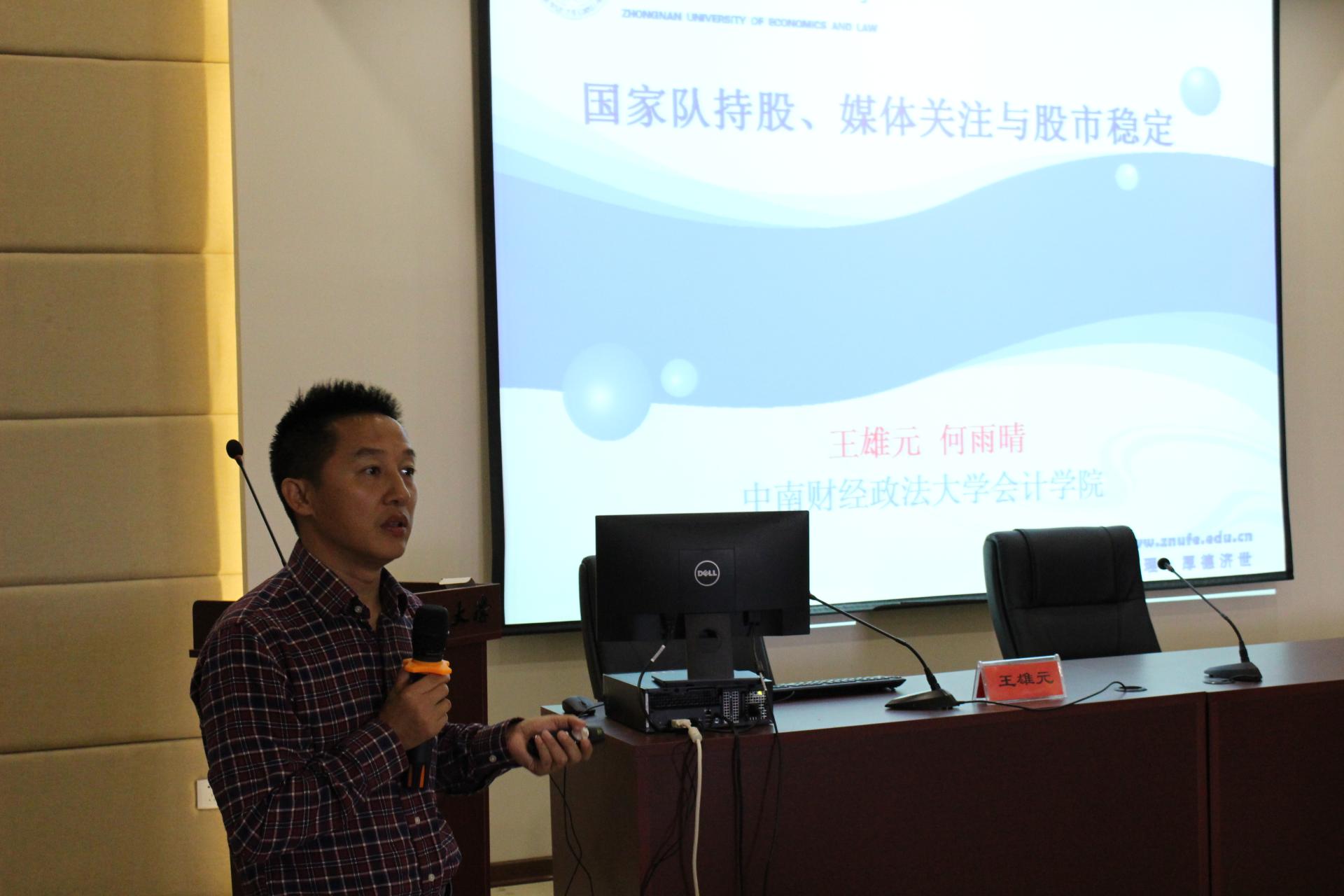 王雄元教授做了题为“国家队持股、媒体关注与股市稳定”的论文交流。王雄元教授提出三个假设,运用实证研究的方法,利用wind数据库、choice数据库、CSMAR数据库的数据解答了国家队持股是否能够降低股价波动性。实证结果表明在一定条件下国家对持股有助于降低股价波动性,而且没有降低市场流动性,同时媒体的报道可以强化国家队持股的股价稳定效应。