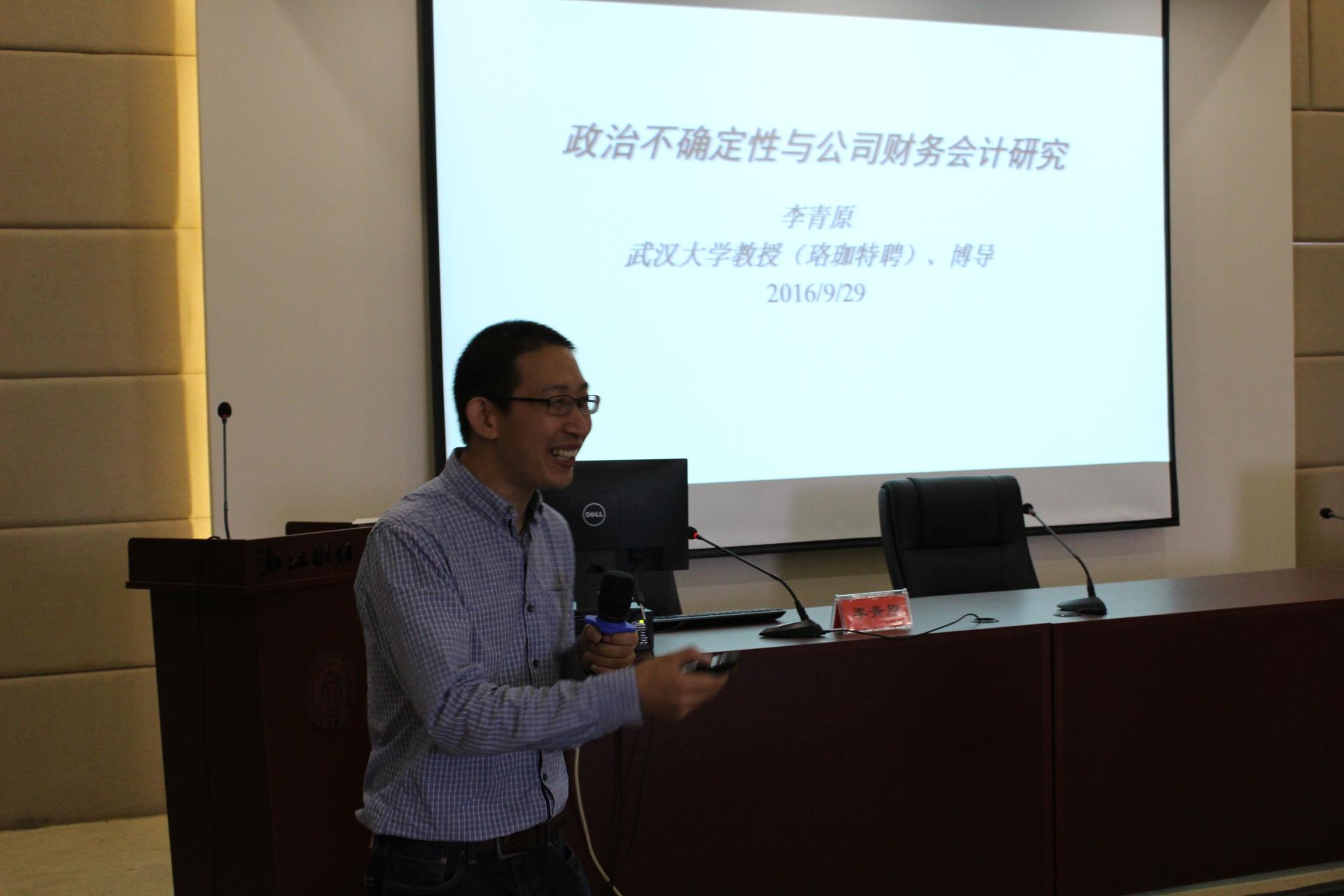 在接下来的学术交流中,武汉大学李青原教授、中南财经政法大学王雄元教授做了学术报告。李青原教授的报告主题为“政治不确定性与公司财务会计研究”。李青原教授通过多篇外文文献回顾介绍了政治行为对公司会计行为、财务行为以及资本市场的影响。他认为政治不确定性会影响公司决策和资本市场,我们应当有效利用这些机会来创造利润,同时就中国地方政治对企业财务的影响提供了新的研究思路。