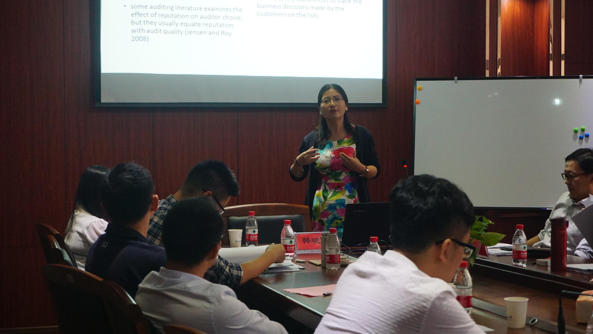 南京理工大学的韩晓梅教授的第四场报告主题为“The benefits of audit firm donations”。韩老师通过实证分析得出两点结论:客户在更换会计师事务所时更愿意选择有捐赠的会计师事务所;有捐赠的会计师事务所会收取更高的审计费用。公司王成方博士对此进行了主点评。