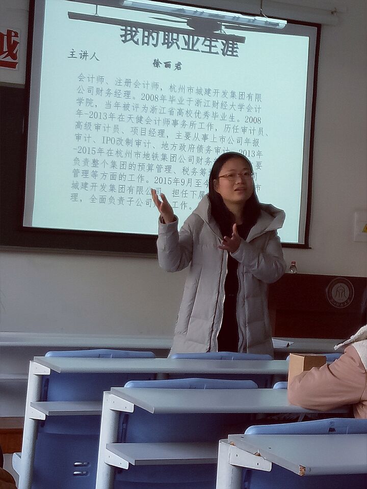 此次讲座的主讲人是永利yl23411官网入口2008届毕业生、浙江省高校优秀毕业生徐丽君,她工作经验丰富,曾在天健会计师事务所、杭州市地铁集团公司财务部工作,现就职于杭州市城建开发集团有限公司,担任下属子公司财务经理,全面负责子公司财务工作。