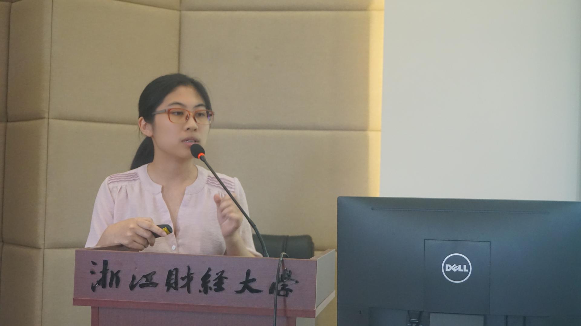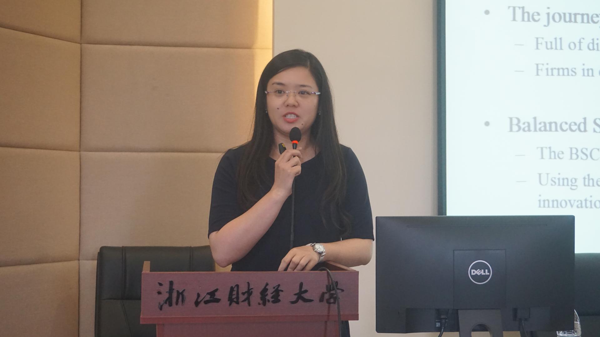 然后,公司张金丹博士给我们带来了题为“Empirical Evidence on the Use of Balanced Scorecard and innovation: Exploring the Role of Firm Competences and the Performance Consequences”的学术报告。张金丹博士先介绍了研究动机,她认为平衡积分卡作为战略管理控制系统,可以为企业在创新的过程中提供正确的关注和支持。基于此,张金丹博士介绍了论文的被解释变量、主要解释变量以及控制变量,并提出了数据模型,通过数据说明了平衡积分卡的使用与企业创新正相关,提供了使用BSC的企业追求创新的绩效后果的证据。