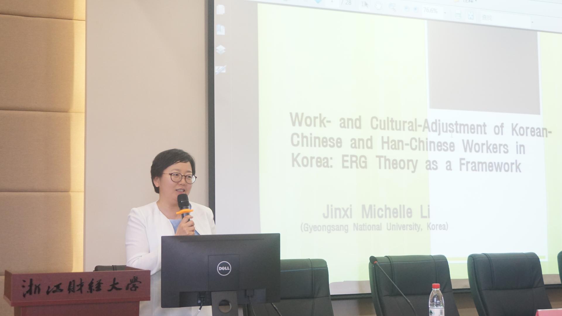 讲座首先由韩国庆尚大学的Jinxi Li教授开始,主题为“Work and Cultural Adjustment of Korean-Chinses and Han-Chinese Workers in Korea: ERG Theory as a Framework”。Jinxi Li教授利用ERG理论作为研究框架,通过一系列研究假设,得出了以下五个结论:首先,对于工作环境的关注是很有必要的;其次,工作适应影响文化适应;第三,生存需求对适应能力的影响比关系需求更大;第四,较差的工作环境对朝鲜族的文化适应有负面影响而对汉族的文化适应有正面影响;最后,权利距离对朝鲜族文化适应有正面影响而对汉族文化适应有负面影响。Jinxi Li教授的讲解丰富有趣,与在场的师生们进行了热烈的交流与讨论。