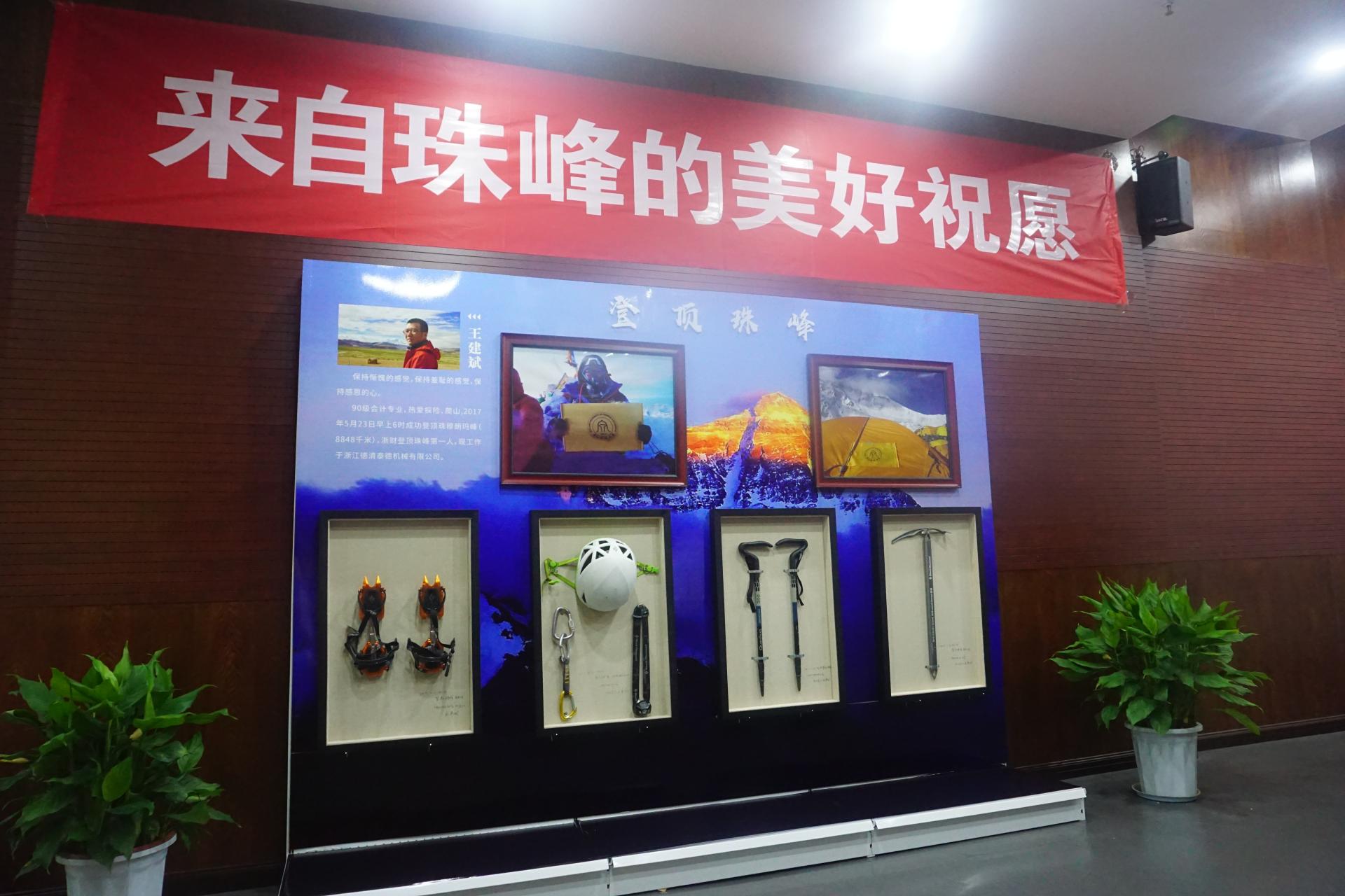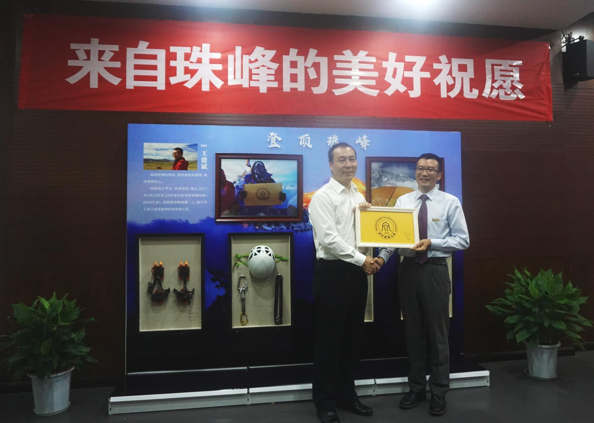 捐赠仪式上,李金昌代表公司接受了王建斌登顶珠峰的装备和公司徽标,励如孟为王建斌颁发了捐赠证书和纪念杯。