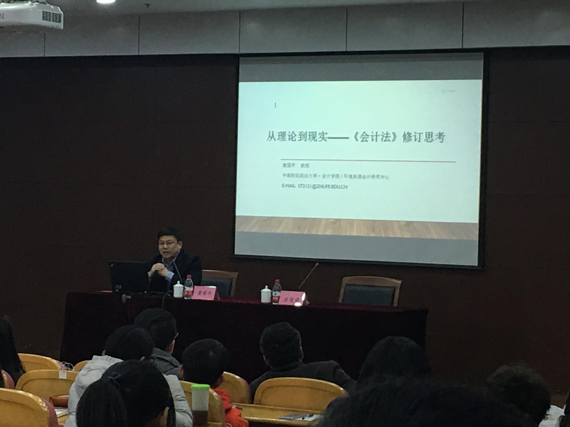 唐教授从会计从业资格证书取消这一引子出发,从政府层面(政府治理方式与政府职能转变)、企业层面(企业市场主体地位)、经验借鉴(国外对内部会计人员与注册会计师的管理模式)等三方面如何去理解这一现象。讲座围绕四个主要内容1.为什么要修订《会计法》?2.如何修订我国《会计法》3.修订《会计法》需要解决哪些重大问题?4.《会计法》修订草案(建议篇)简介开展。同时强调了现行《会计法》的特征,在规范的内容上,侧重于财务会计核算,在规范的对象上,侧重于企业单位、国有单位、大中型单位的会计行为,而忽略了政府与非营利性组织。在会计监督方面,侧重于突出政府监督的作用,而忽略了会计监督体系的构建与有效运行。在法律责任方面,侧重于强调行政法律责任,而忽略了会计法律责任体系构建。在分析现行会计法的不足时,主要是《会计法》规范的会计工作内容不能适应经济社会发展和会计行业发展的显示需要,《会计法》所确立的三位一体的会计监督体系未能发挥其应有作用,《会计法》的威慑力和约束力不够。紧接着,唐教授就如何修订《会计法》的原则和思路以及修订需要解决的重要问题与依据进行了详细解读。