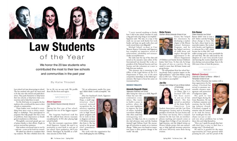 “出生并成长于中国、此时留学美国的我,本身就是一个天然的中国文化传播载体。同时,我也致力于成为促进中美两国之间交流、合作的桥梁。因此,这次获得美国法律界权威杂志的认可,让我感到很欣慰!”仇隽如是说。