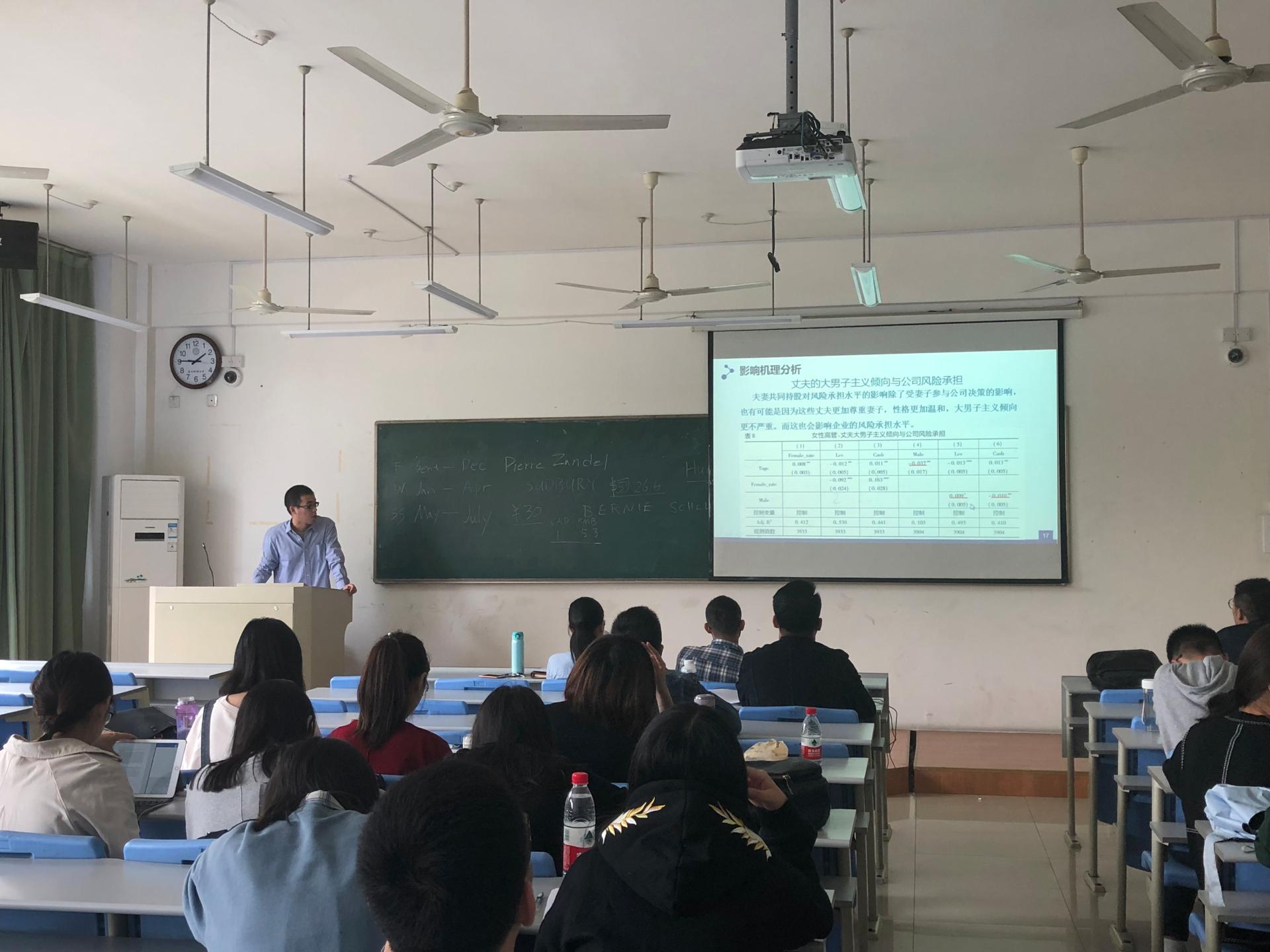 首先,黄嘉磊同学讲解本次选取的论文,题目为《“保守”的婚姻: 夫妻共同持股与公司风险承担》。他分为论文回顾、研究设计与实证分析、影响机理分析、进一步研究和结论五个方面进行讲解。该文以婚姻、家庭与公司财务行为的关系作为研究动机,提出了文章的假设,构建模型并通过内生性检验证实夫妻间的持股安排会显著影响公司的风险承担水平,并且夫妻关系是影响夫妻股权配置进而影响家族企业风险承担水平的重要因素。温日光老师和王会娟老师对该文章进行了点评,首先该论文将社会学和财务相结合,是一个很重要、很新颖的选题,因此被选入《经济研究》;其次,工具变动与解释变量有一定的关联性,本文应该将地区经济水平作为控制变量。
